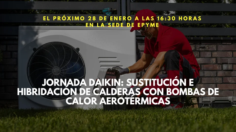 Te informamos que el próximo 28 de enero a las 16:30 horas, tendrá lugar en Epyme una jornada técnica presencia sobre aerotermia, de la mano de nuestro socio colaborado DAIKIN AC SPAIN, S.A.