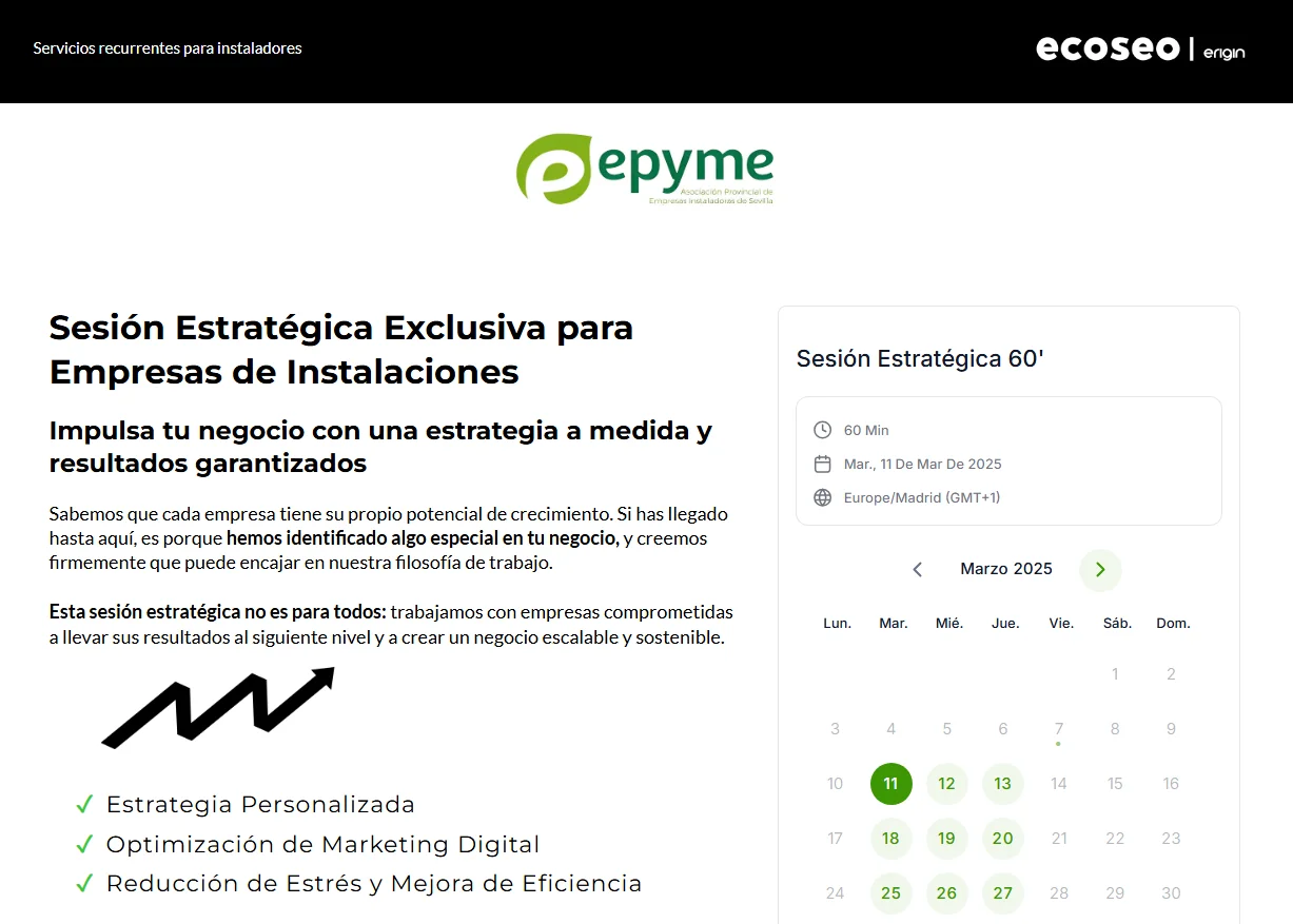 Si eres una empresa instaladora y quieres aumentar tu facturación sin asumir ningún riesgo, esta oportunidad es para ti. Ecoseo está seleccionando a 5 empresas altamente cualificadas para una sesión estratégica SIN COSTE, donde se validará un método probado para generar ingresos recurrentes y previsibles.