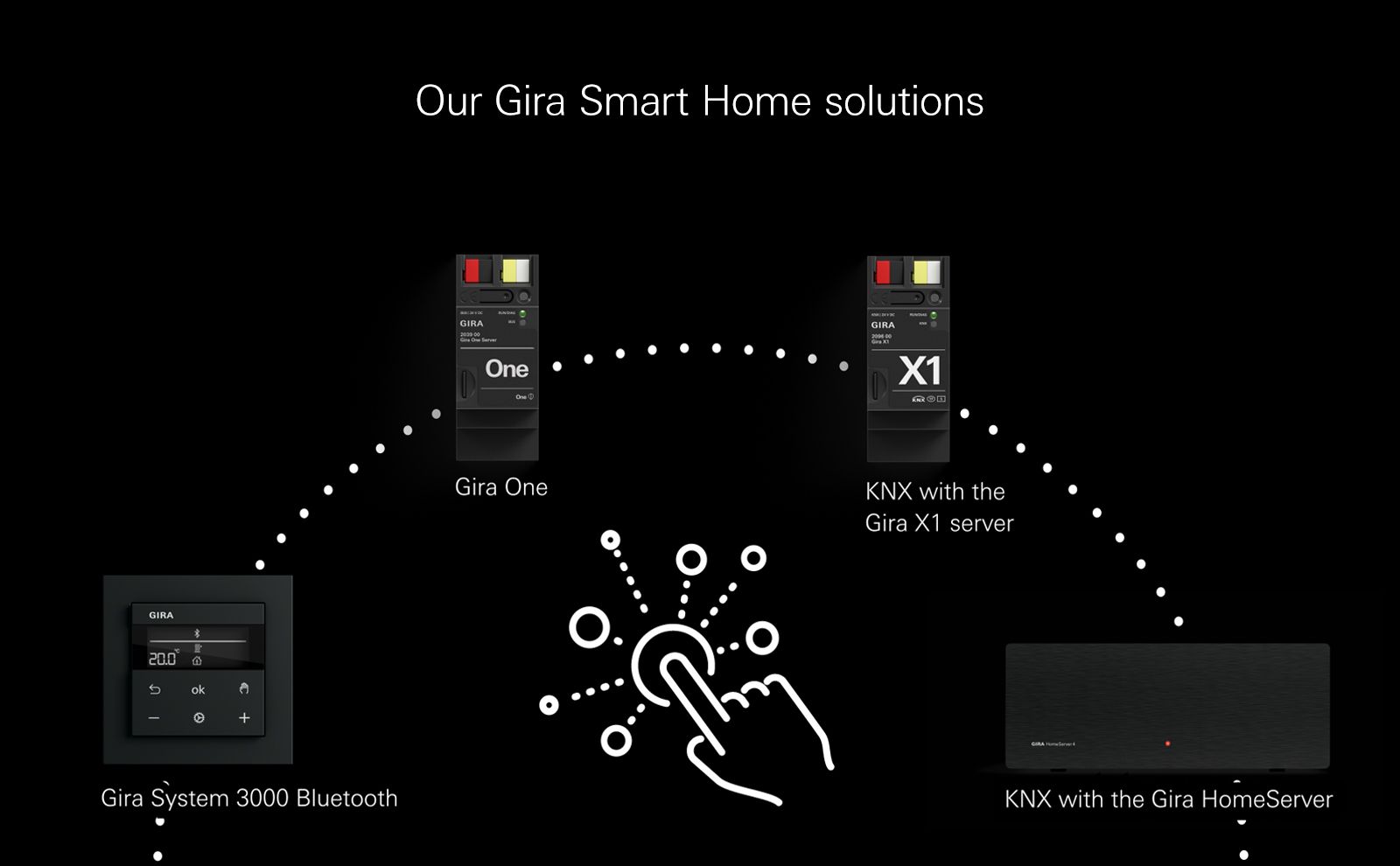 Cuatro sistemas componen principalmente la oferta de Gira en materia de Smart-Home, pasando por el Gira One para combinar confort, seguridad y eficiencia energética; el Gira KNX; el Gira System 3000 que incide principalmente en persianas, luces y calefacción; para terminar en el Gira KNX RF System especialmente pensado para reequipar edificios existentes y conseguir un hogar inteligente y preparado para el futuro.